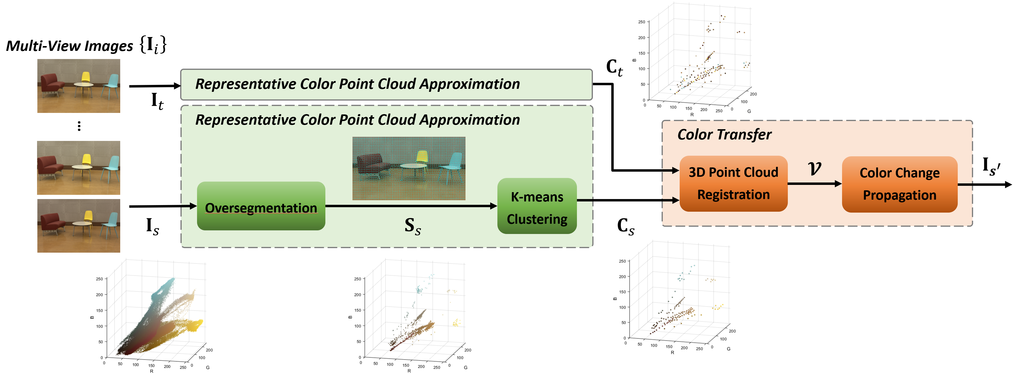 proposed method transforms the color point cloud of the source image into that of