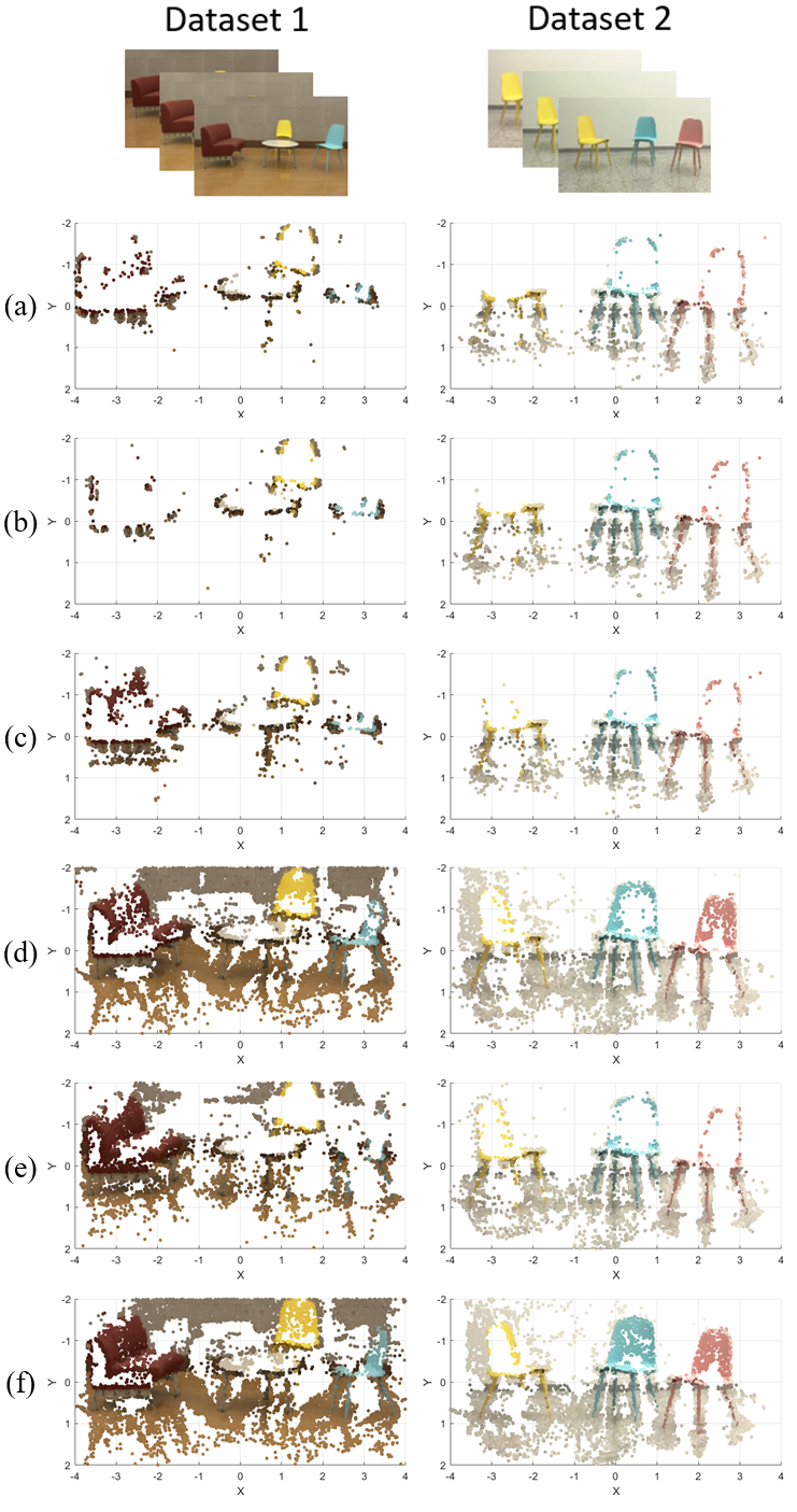 Fig. 4. 3D reconstruction results using: (a) color-inconsistent images; (b) images obtained by CT[6]; (c) images obtained by GC[7]; (d) images obtained by PR[8]; (e) images obtained by OPT[9]; (f) images obtained by the proposed method.