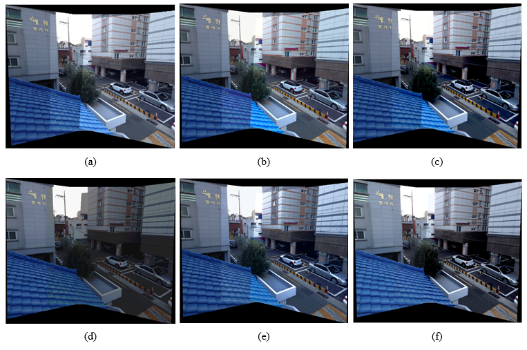 Fig. 5. Image stitching results using: (a) color-inconsistent input image; (b) images obtained by CT[6]; (c) images obtained by GC[7]; (d) images obtained by PR[8]; (e) images obtained by OPT[8]; (f) images obtained by the proposed method.