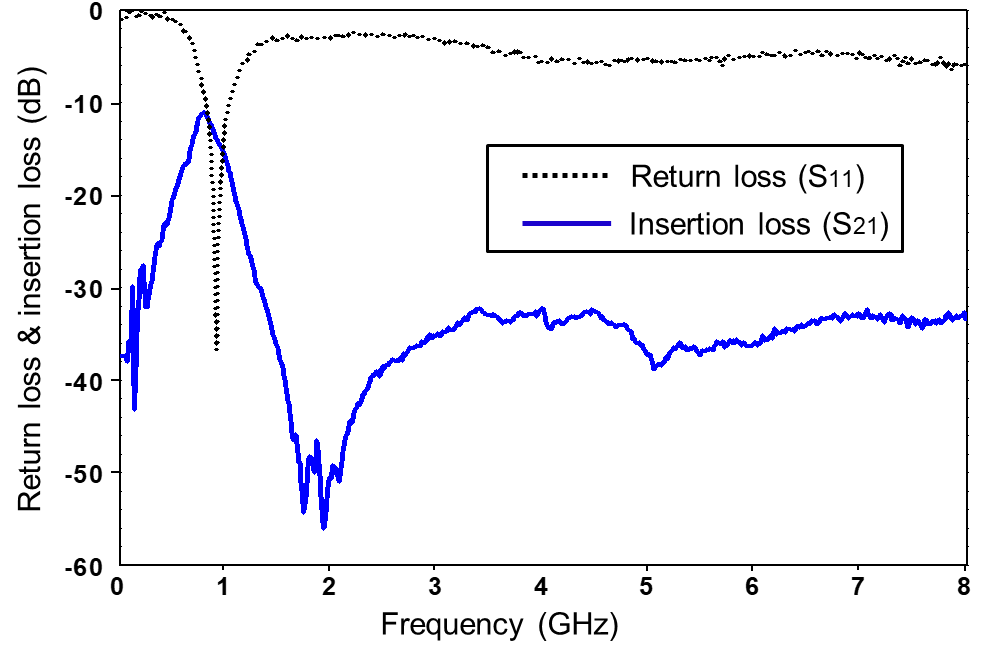 785 MHz, insertion loss (S$_{21}$) of 11 dB, return loss (S$_{11}$) of 33 dB, a selectivity
