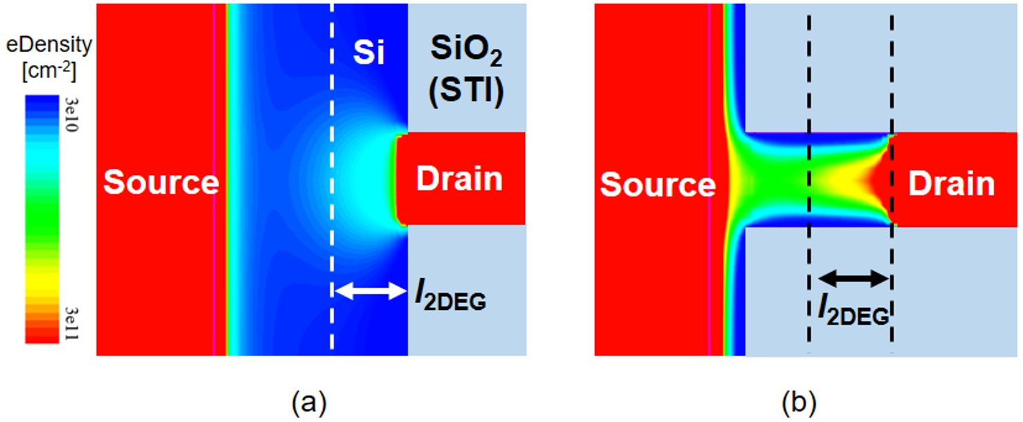 2DEG}$). (b) The device simulation results as structural symmetry and asymmetry boundary