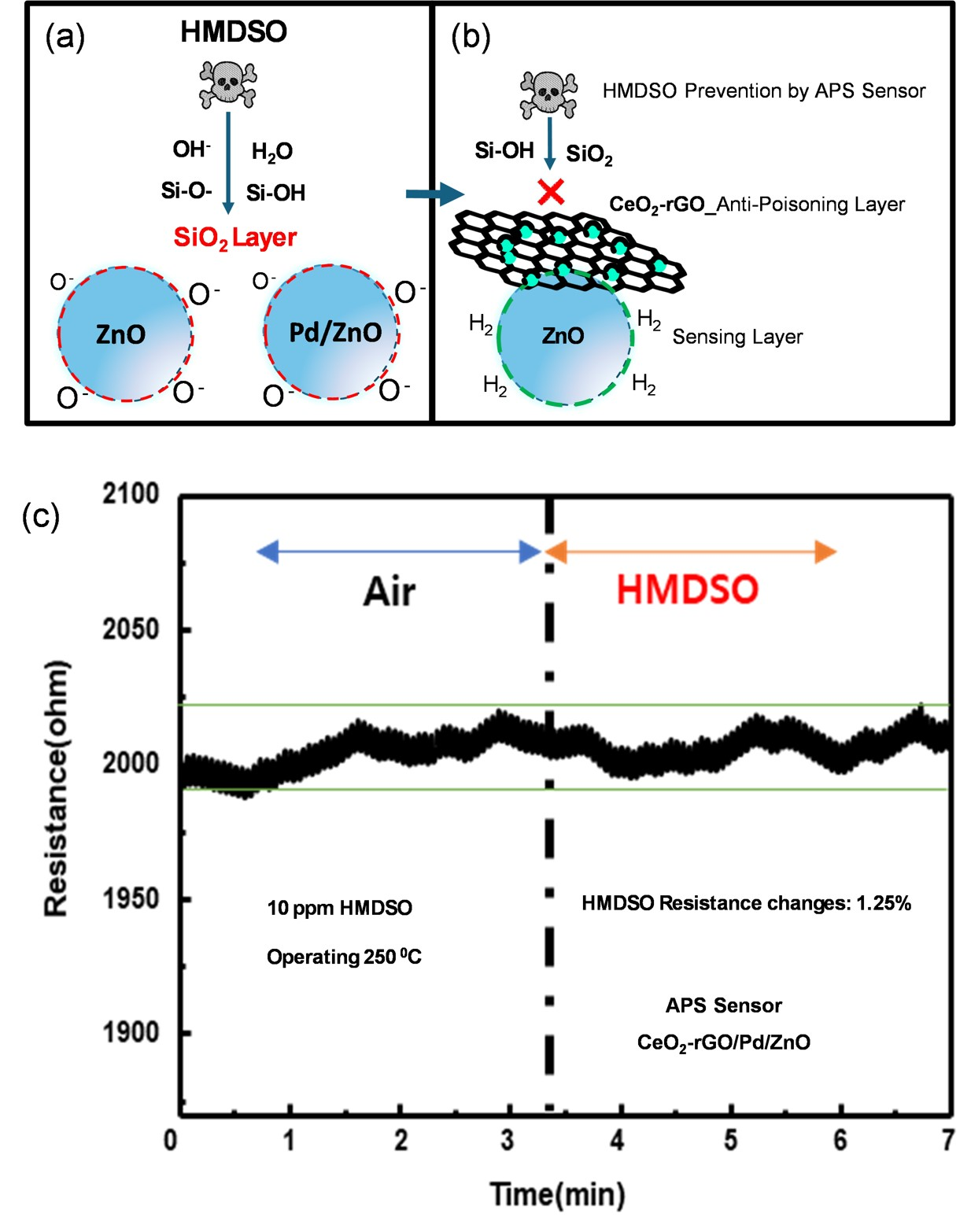 Anti-poisoning sensors, Pd/ZnO, CeO2-rGO, HMDSO, Anti-poisoning mechanism