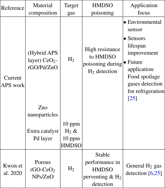 indicating the potential for long-lifespan MOS sensors [6]. APS utilizes CeO${}_{2}$-rGO anti-poisoning layer coatings on Pd decorated ZnO NPs