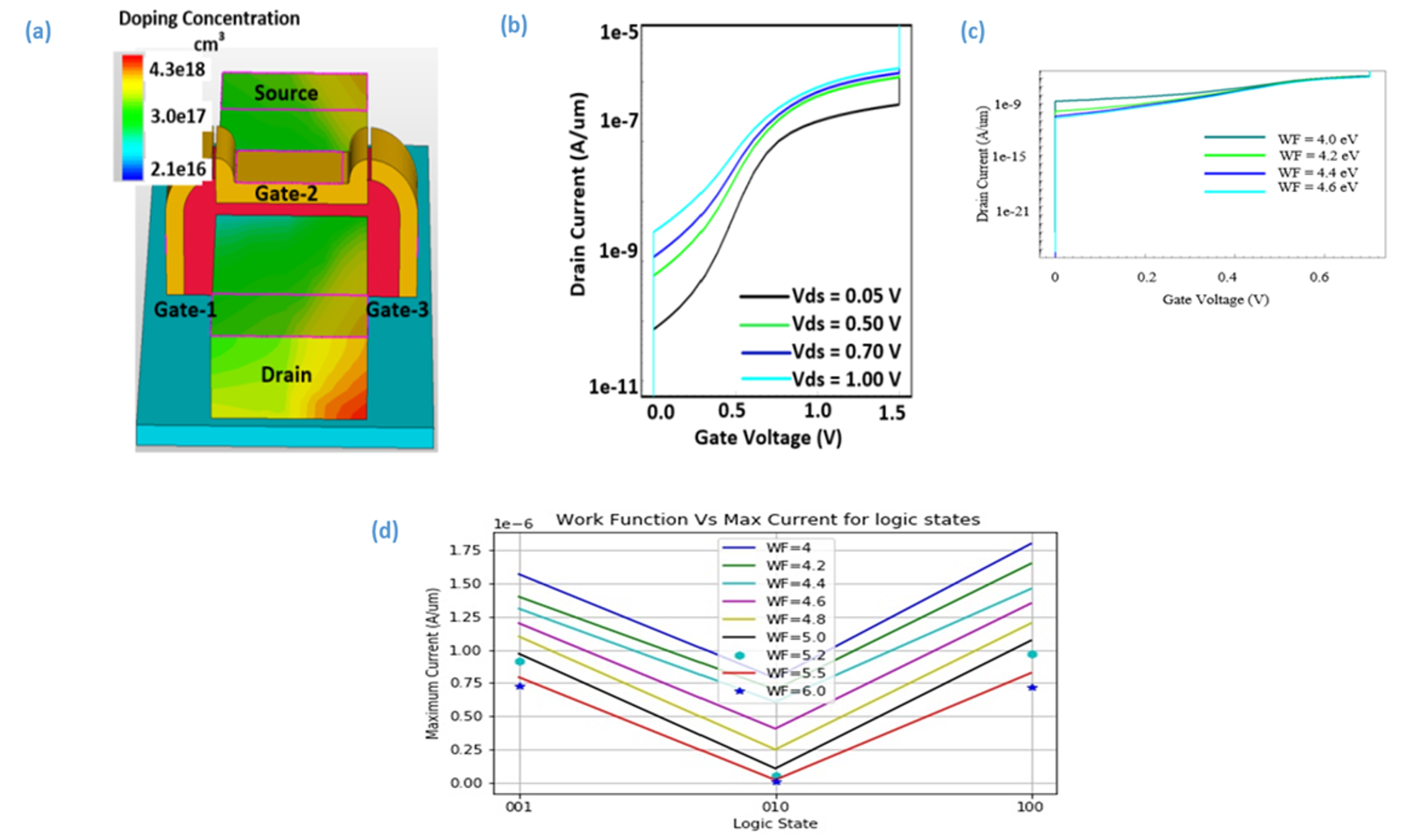 our 14 nm technology FinFET is depicted in Fig. 8(d). From Fig. 8(d), for 4.6 eV work function for logic 1 On current is 1.5 e–6 A. From Sprocess and