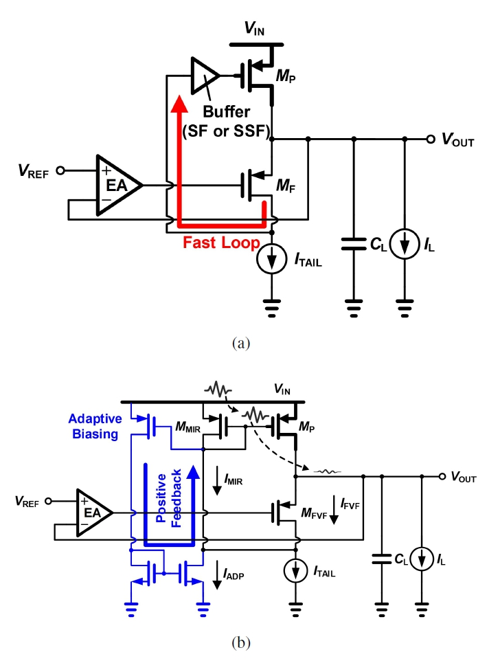 Fig. 1. Existing FVF-based LDOs: (a) with a buffer at the power transistor gate [6,7], and (b) with a noise-cancelling transistor and an adaptive biasing circuit [9].