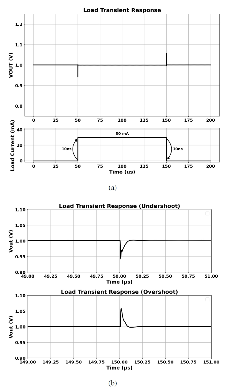 Fig. 7. Simulated load transient response: (a) Waveforms of VOUT and the load step (0↔30 mA), and (b) undershoot and overshoot of VOUT.