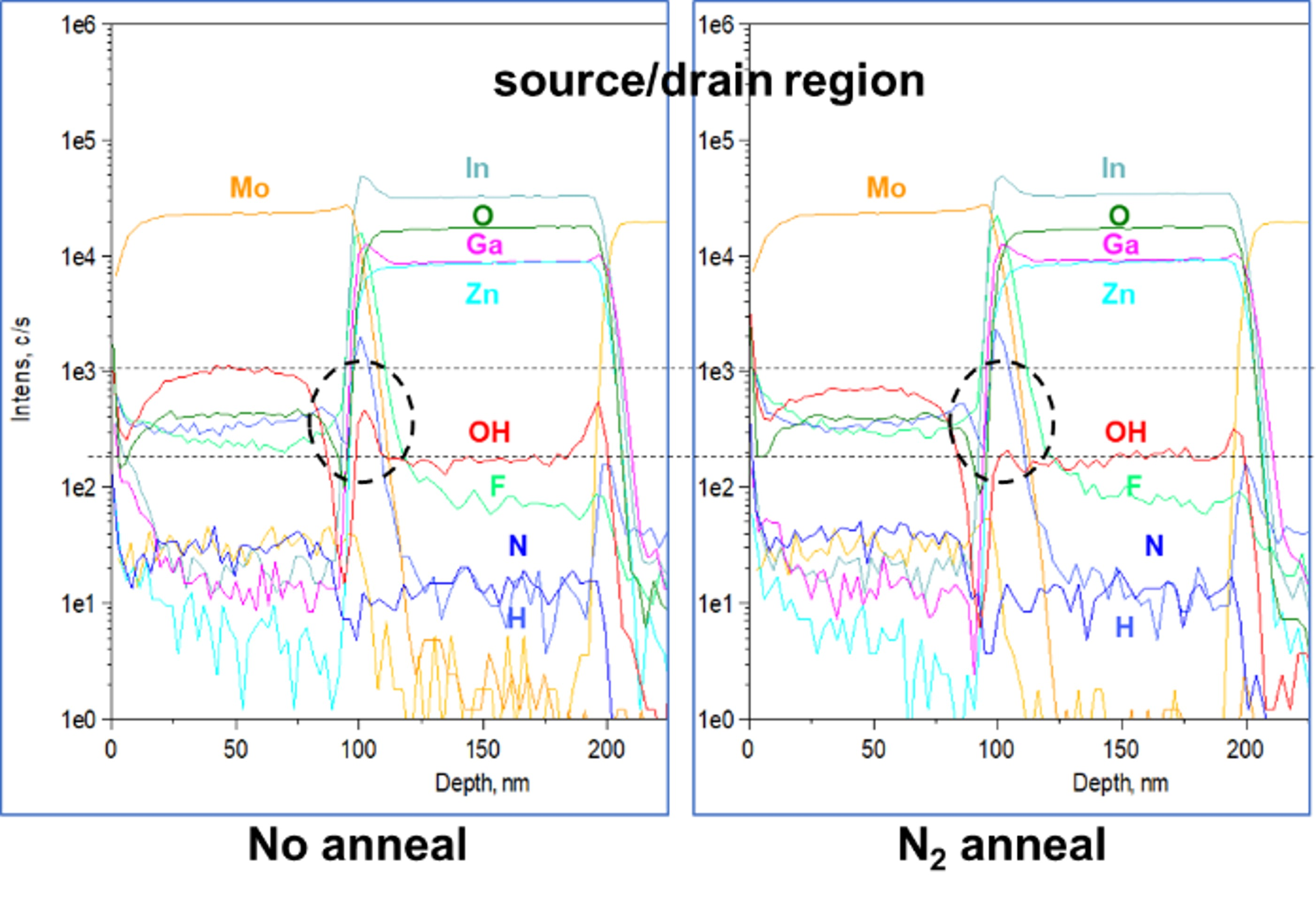 TFT, IGZO, electrical characteristics, process parameters, N2 anneal, SIMS, X-ray photoelectron spectroscopy (XPS), transmission electron microscope (TEM)