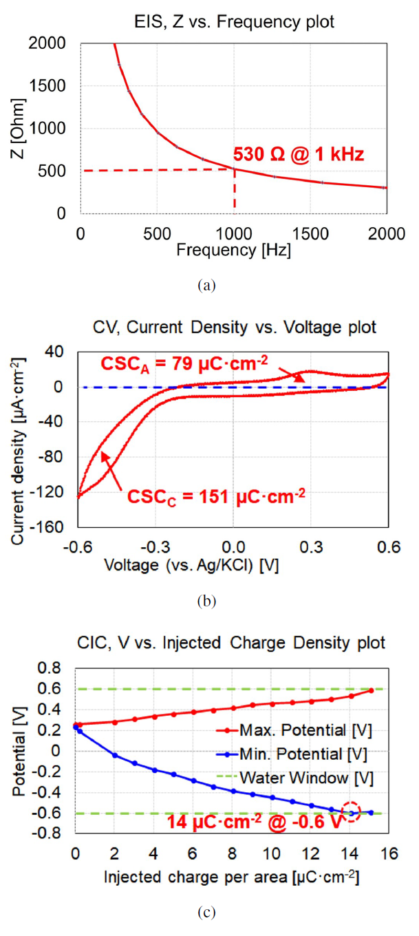 $\Omega$ (normalized: 2.64 k$\Omega$$\cdot$mm2), a CSC of 230 $\mu$C/cm2, and a CIC of 14 $\mu$C/cm2, which are within the range applicable to neural interfaces. The integrated thermistor