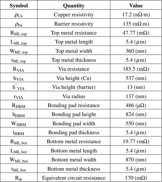 Fig. 2(a) presents a simple circuit model using dimensions and metal resistivity [12]. The dual damascene hybrid bonding structure is divided into three main parts in