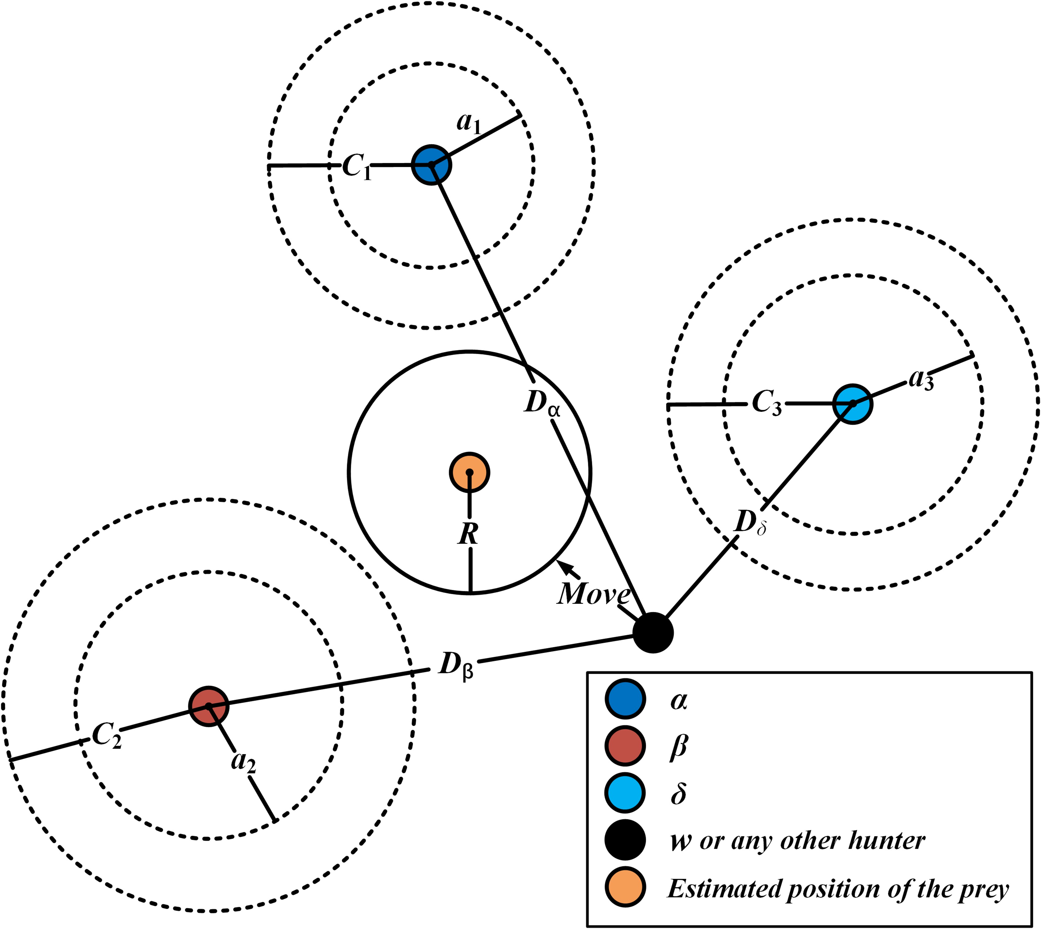 The hunting behavior is usually guided by the alpha, as shown in Eqs. (12)-(14). $\overrightarrow{D_\alpha}$, $\overrightarrow{D_\beta}$, $\overrightarrow{D_\delta}$