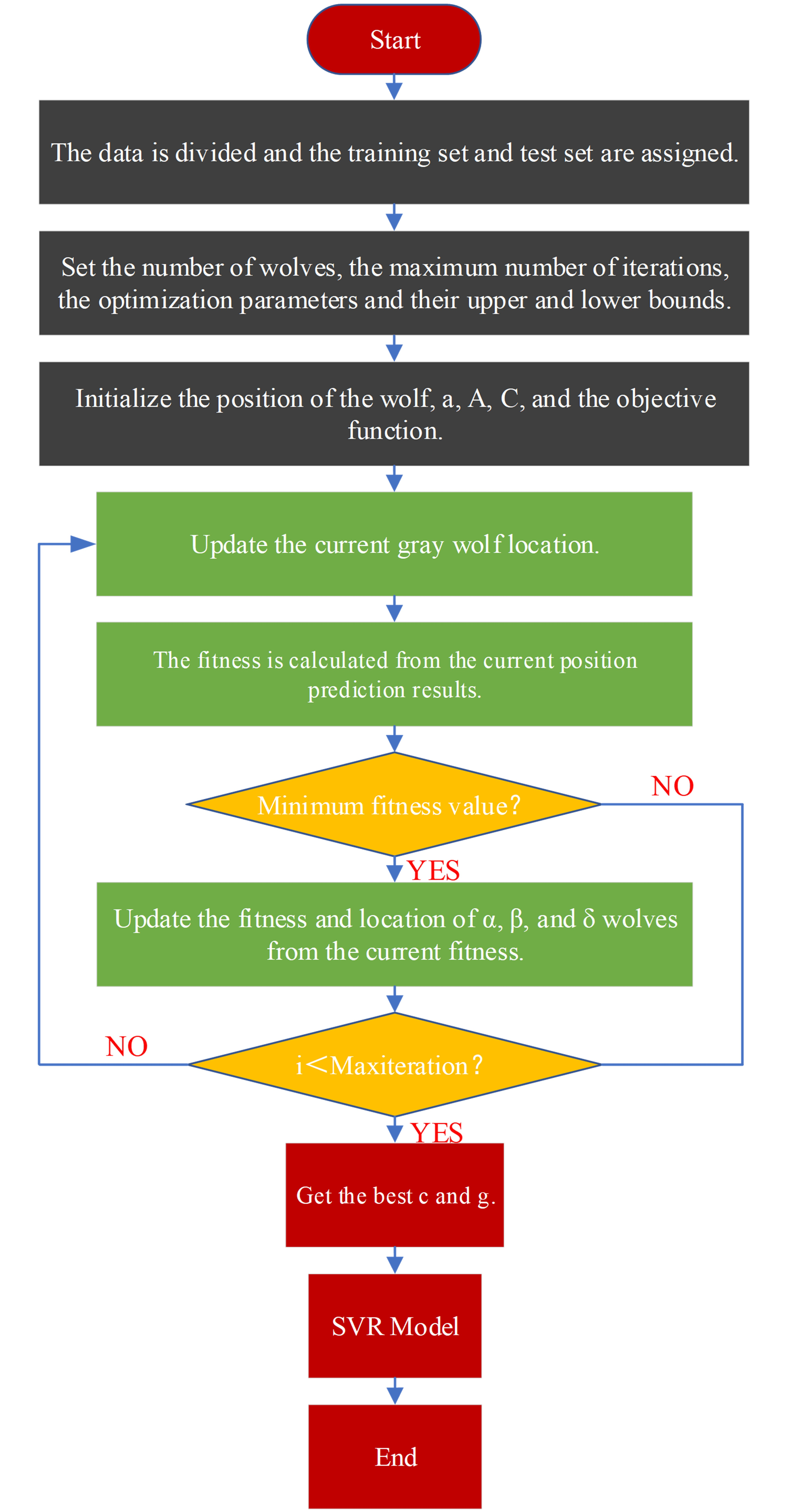 the SVR model. The positions of the grey wolves are updated based on the calculated