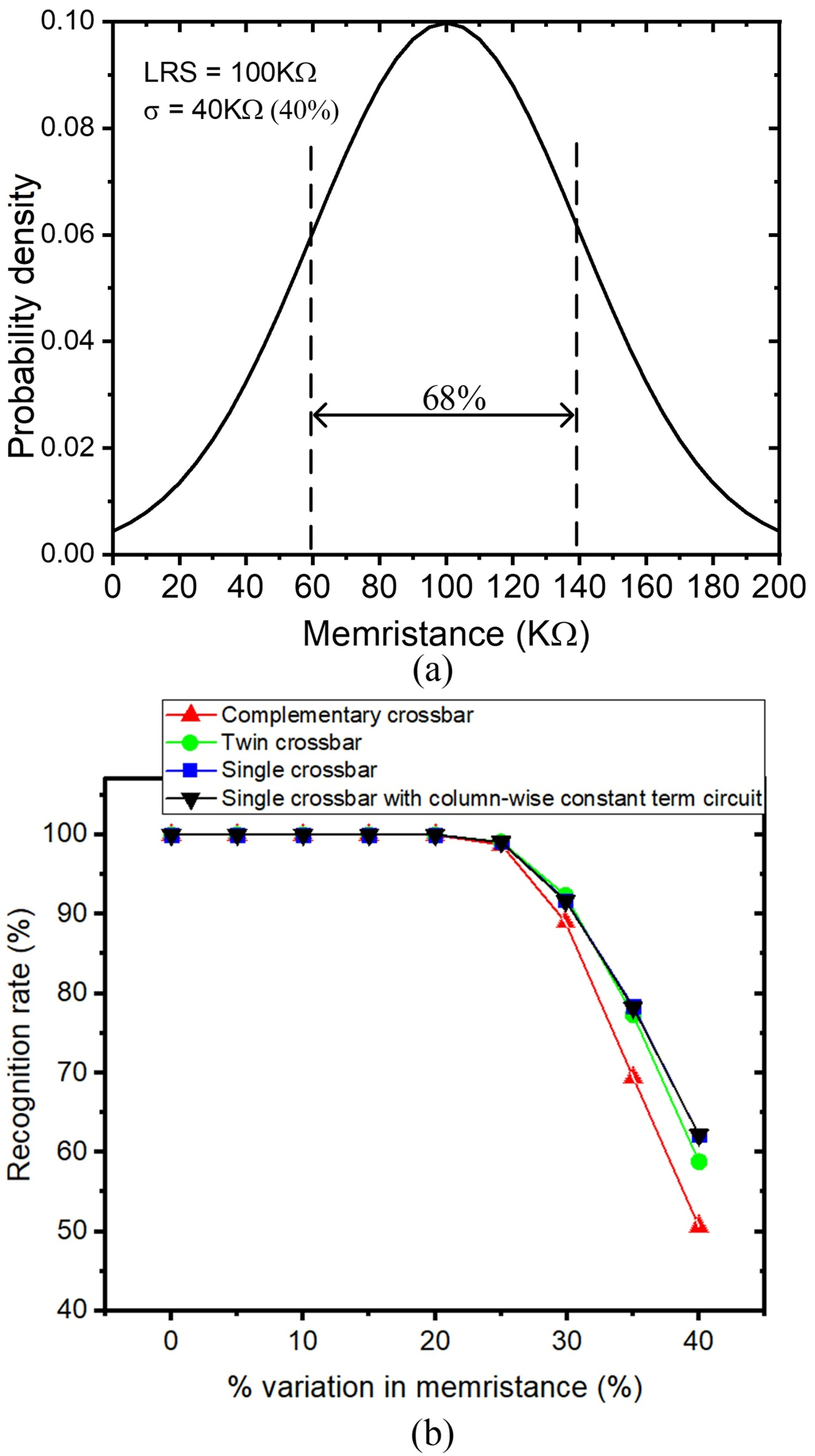 of memristance variation, achieving a recognition rate of 58.8%. The single crossbar