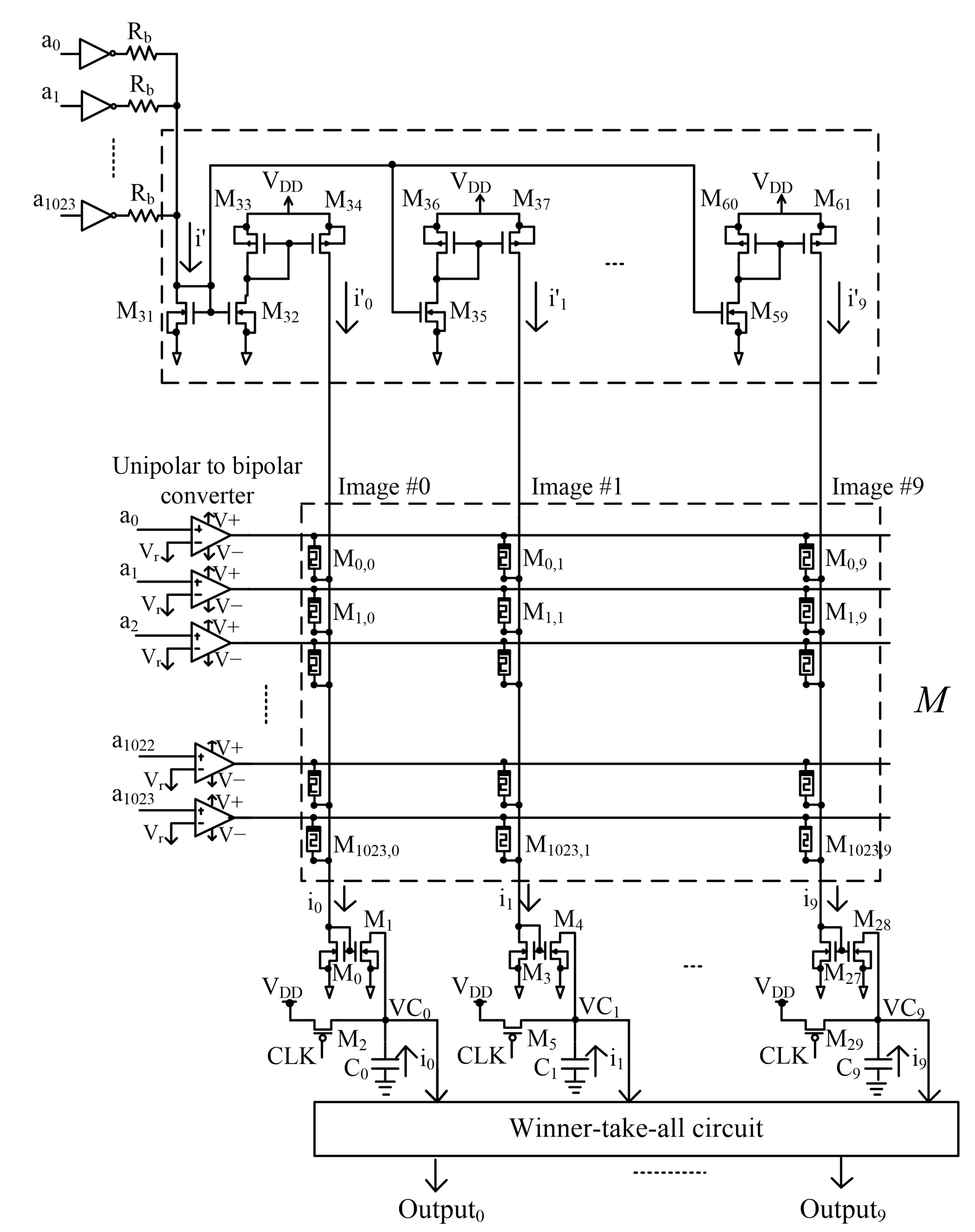 crossbar circuit with bipolar inputs for neuromorphic image recognition [29]. This architecture is an optimized version of the memristor-based neuromorphic designs,