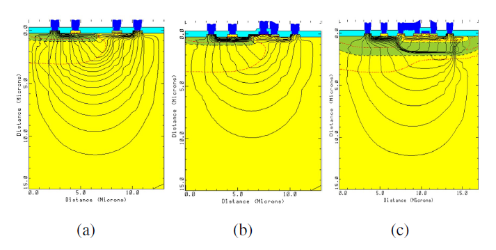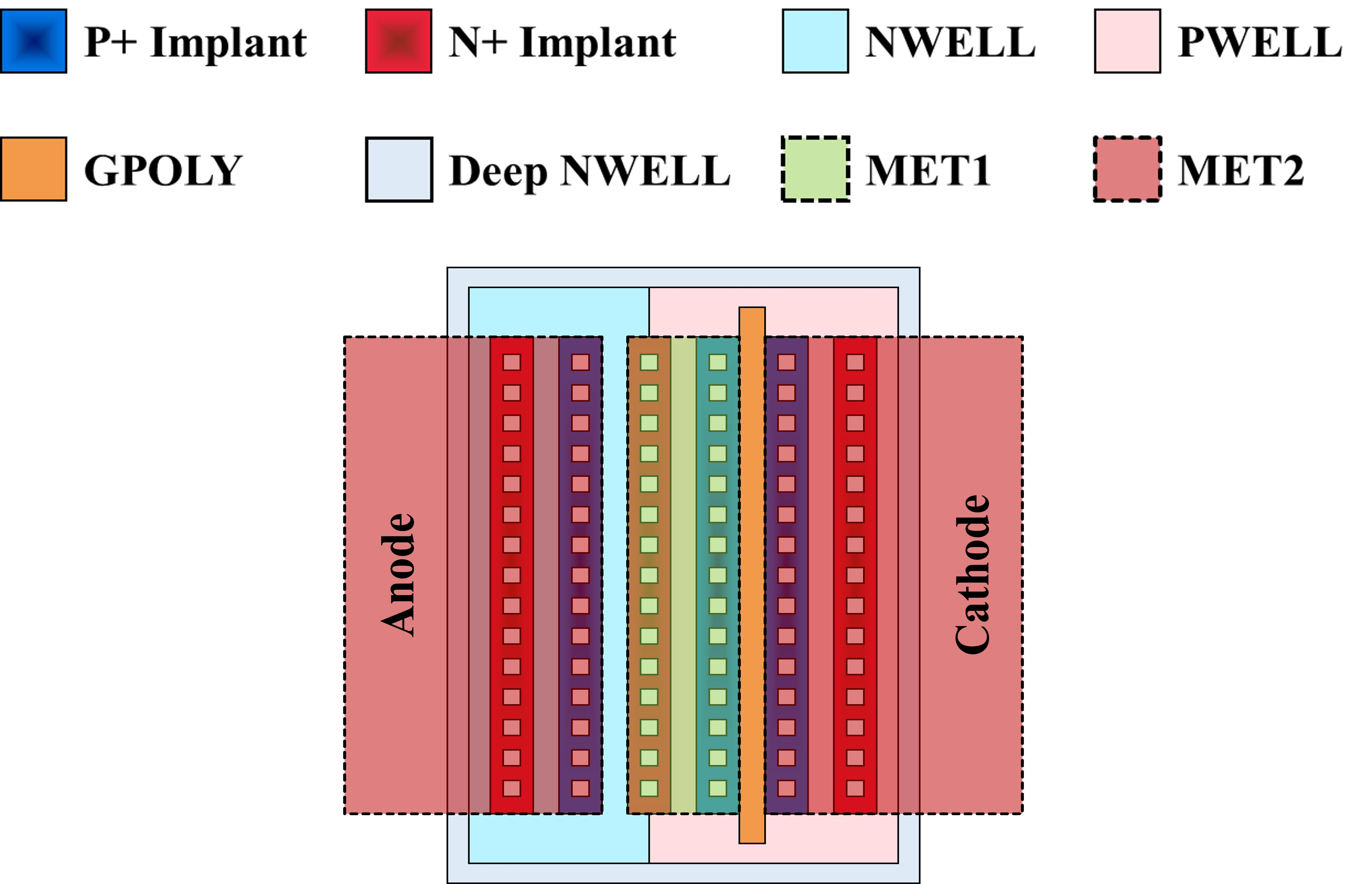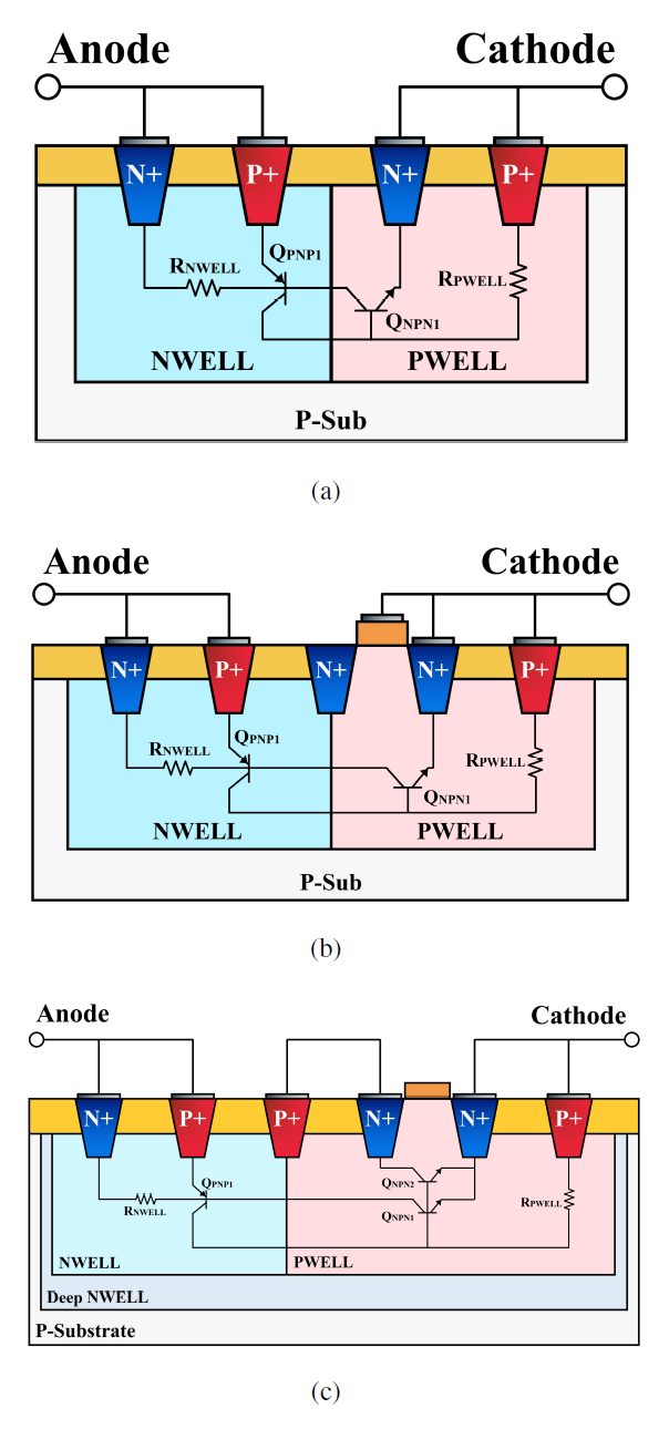 similar to the LVTSCR, incorporates a heavily doped P+ region between the wells to lower the trigger voltage and introduces an additional
