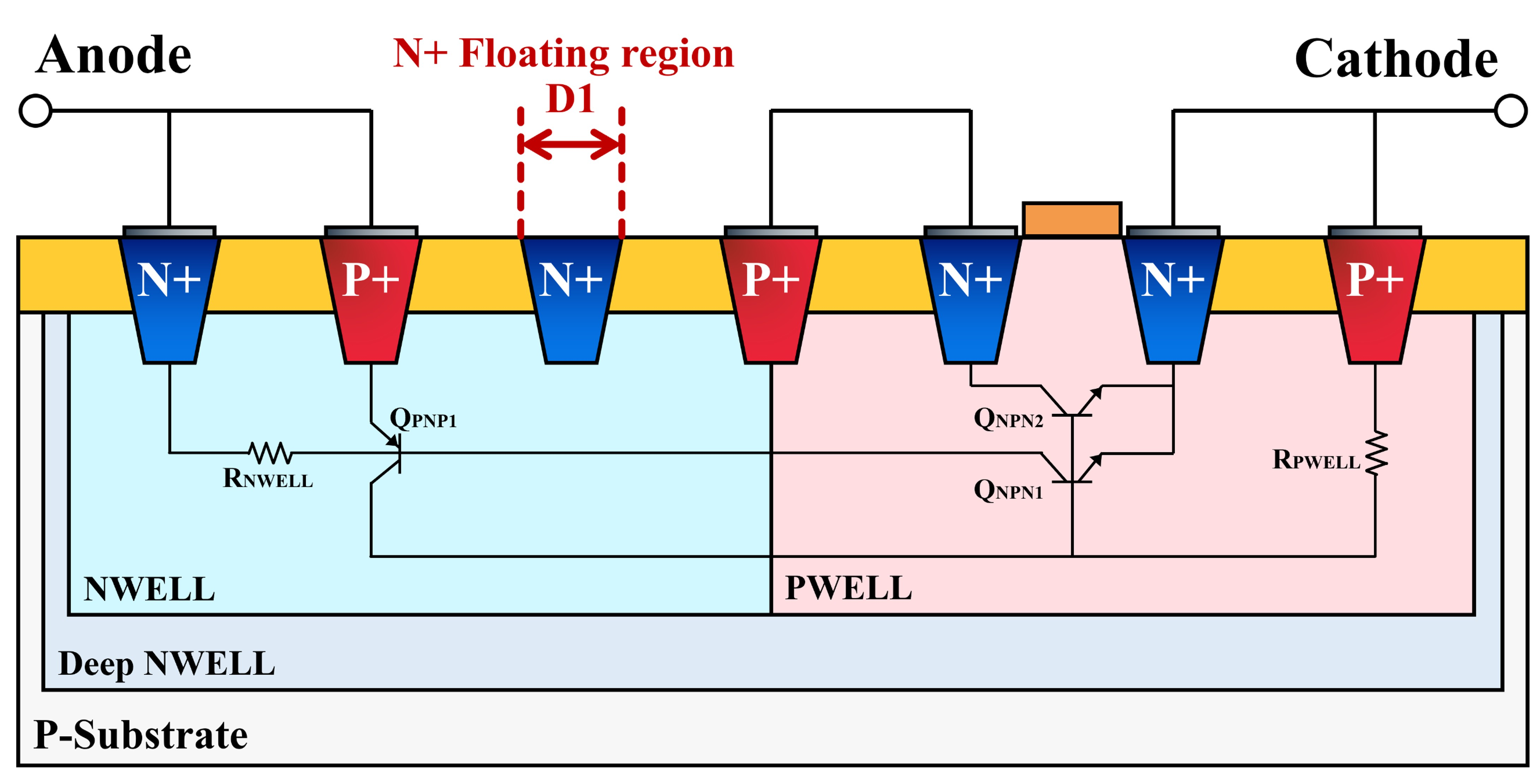 the reverse bias between the N-well and P+ region. However, when an ESD surge is applied to the anode, the potential of the