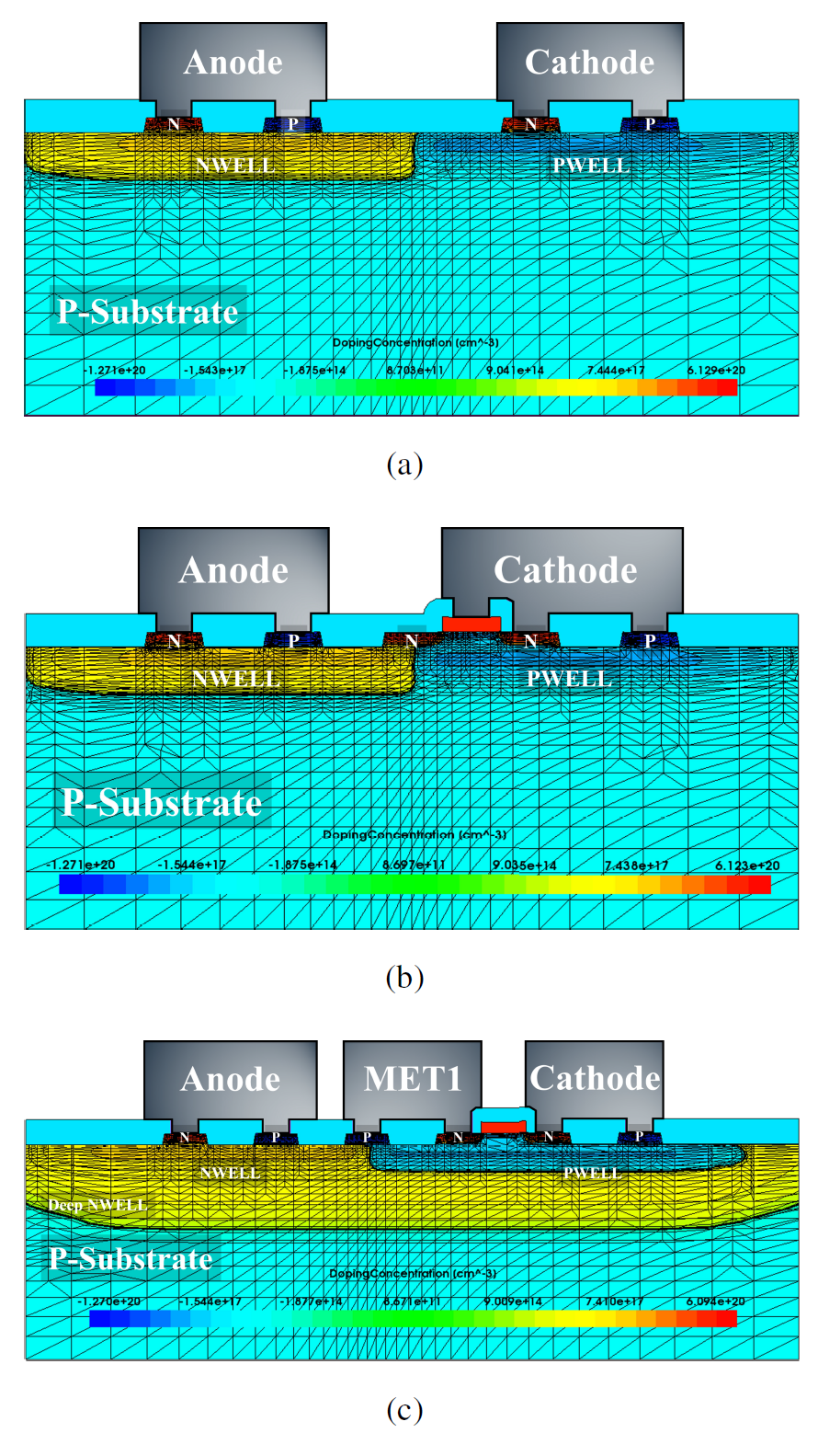 Fig. 1 shows the cross-sectional structures of the SCR, LVTSCR, and the proposed ESD protection